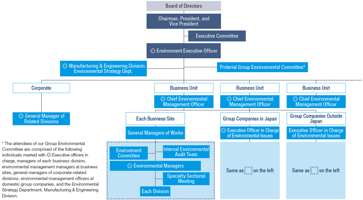 The executive in charge of manufacturing and technology is in charge as an Environment Executive who is well acquainted with environmentrelated issues and exercises overall control through the Group Environmental Committee.