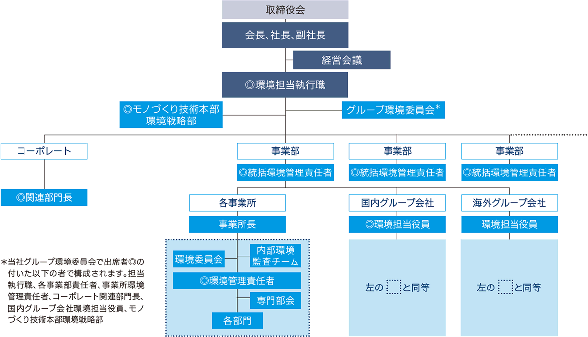 モノづくり技術担当執行職が環境関連問題に精通した環境担当執行職として、グループ環境委員会を通して全体を統制する。