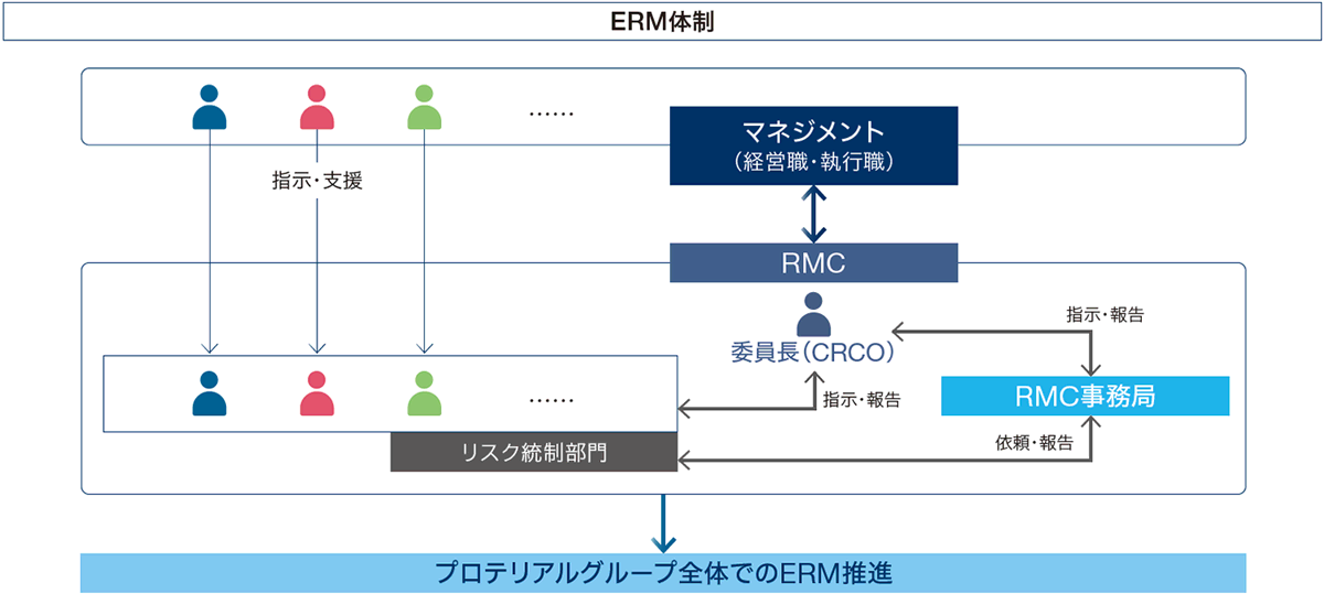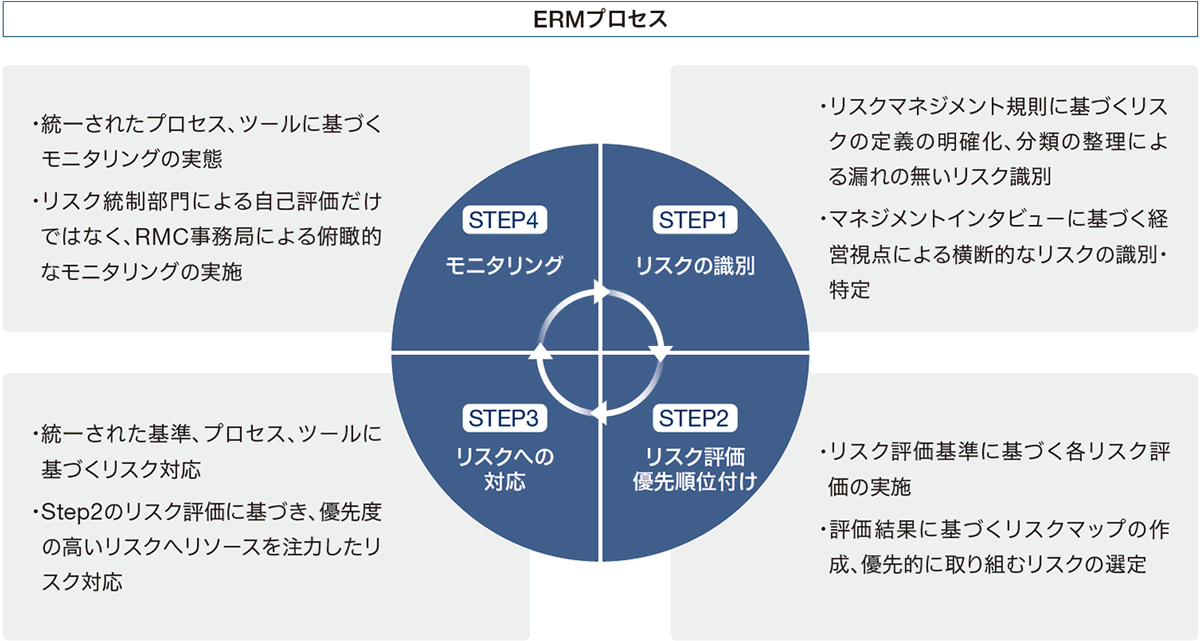 当社グループでは、ボトムアップアプローチに加え、トップダウンアプローチ、すなわち、マネジメネント(経営職および執行職)が経営視点で横断的・中長期的なリスクの抽出・統制をするERM(Enterprise Risk Management)体制を構築しています。CRCO(Chief Risk Control Officer)を委員長とするリスクマネジメント委員会(RMC)が、リスクの識別、評価、優先順位付けなどのERMプロセスを実行し、当社グループ全体のERMを推進しています。リスクは「戦略リスク」「オペレーションリスク」「全社リスク」として分類し定義を明確化し、抽出したリスクを影響度および発生可能性ごとに4段階で評価します。評価結果に基づきリスクマップを作成し、Highゾーンに位置付けられたリスクから重要性や緊急性を考慮して優先リスクを選定し、対応策の実行とRMCでのモニタリングにより管理していきます。グループ環境委員会ならびにコーポレート部門や各事業部門にて把握された気候変動に関するリスクは、環境規制等に係るリスクの一つとして、他のリスクと合わせて、ERMの対象リスクとしてRMCによるモニタリング等が実施されています。RMCでは、リスクの対応状況やそのモニタリング結果が共有され、マネジメネントにも報告されています。
