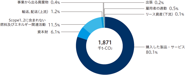 2024年度のScope3排出量は全体で1,871千t-CO2であり、その中でも「カテゴリ1:購入した製品サービス」の割合が80.1%と最大でした。