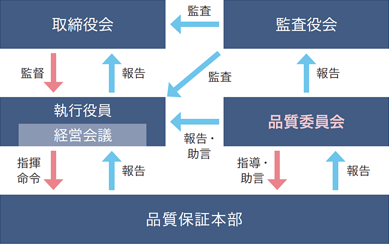 品質委員会の活動は、品質コンプライアンス活動を含む当社品質活動全体について客観的視点で評価し、「品質コンプライアンス問題」が再発しない仕組みづくりとマネジメント、風土の構築、品質管理・品質保証活動の活性化を目的としています。具体的には、品質保証本部が当社の「品質コンプライアンス問題」の再発防止活動や品質管理・品質保証活動について取りまとめ品質委員会へ報告し、品質委員会は当社活動に対する指導・助言を行います。